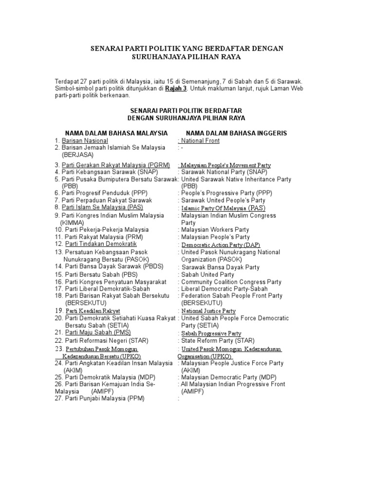 Senarai parti politik yang menang dalam pilihan raya umum malaysia mengikut kawasan parlimen. Under the current legislation, all political parties (termed political associations. Senarai parti politik di malaysia beserta logo rasmi. This is a list of political parties in malaysia, including existing and historical ones. Senarai parti yang berdaftar boleh didapati di senarai parti berdaftar di spr.